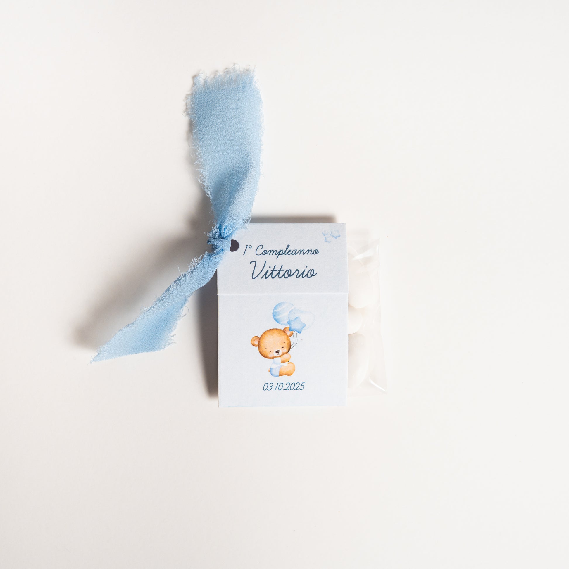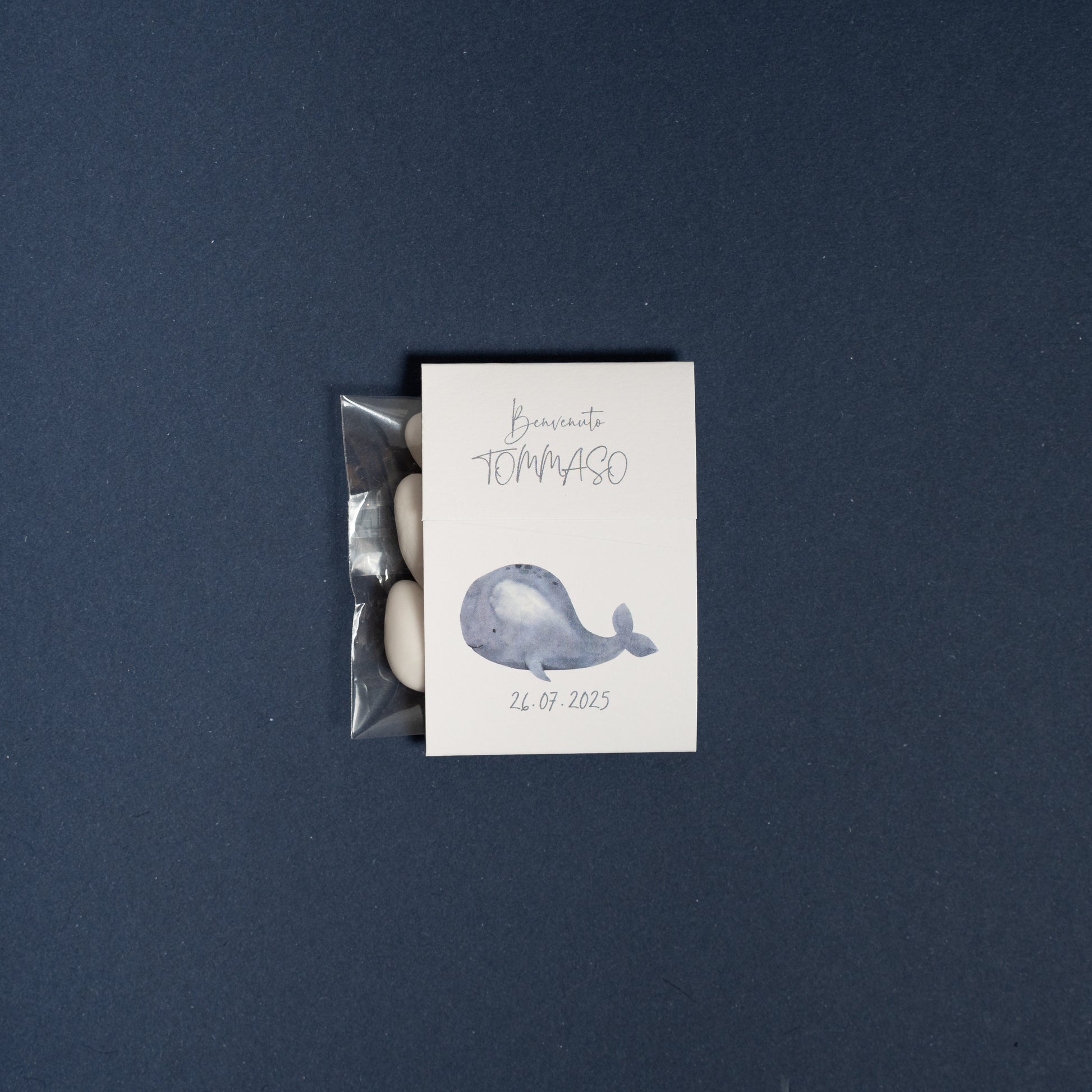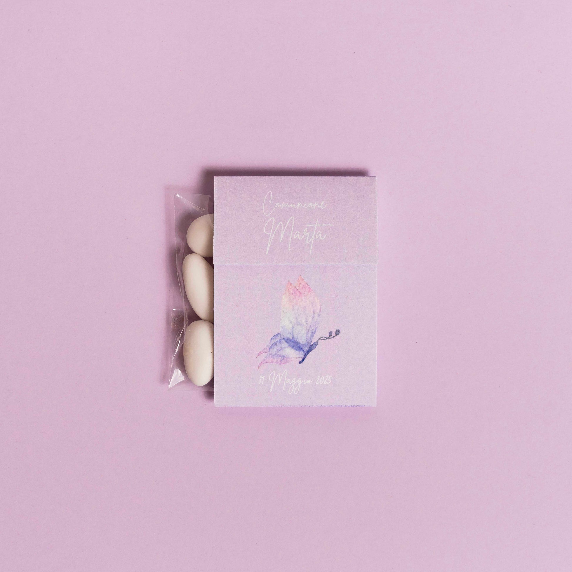 Realizzata in cartoncino stampato a tema, la confezione è prepiegata e personalizzata con il nome e i dati della celebrazione, per un risultato armonioso e coordinato con lo stile dell’evento.