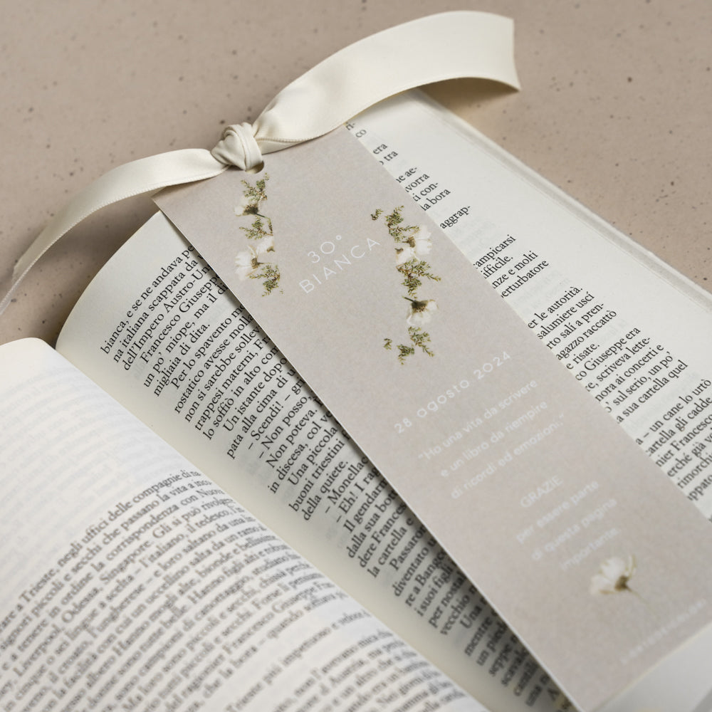 Delicato segnalibro in cartoncino, pensato per ringraziare gli ospiti e lasciare un piccolo ricordo dell’evento. Può essere scritto a mano con un messaggio personalizzato, una frase speciale o semplicemente il nome e la data della celebrazione.